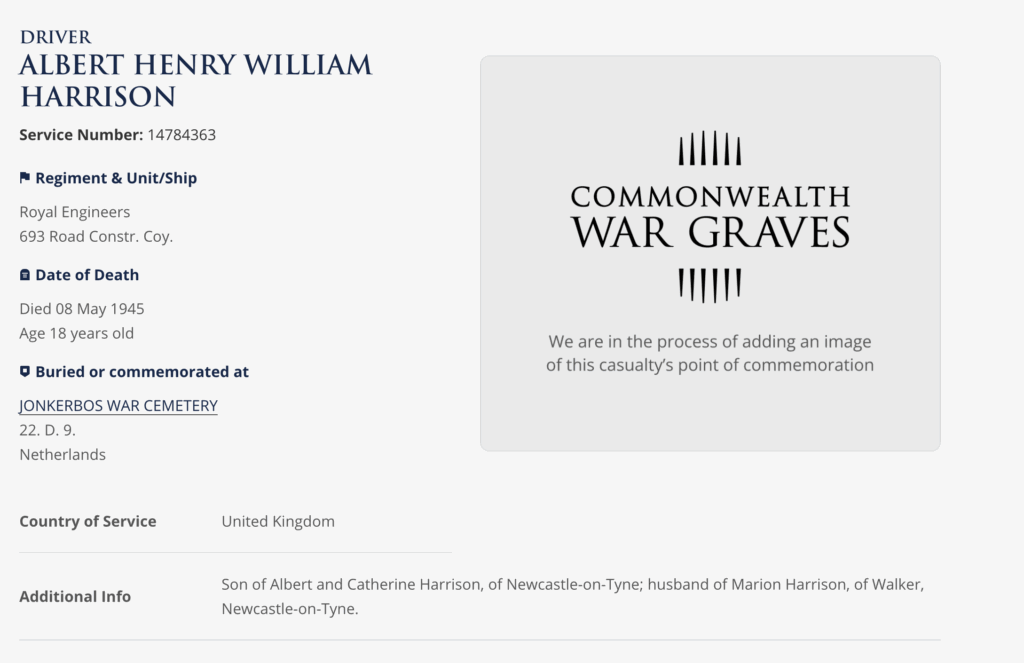 Albert was driver of the 693e Road Construction Company of the Royal Engineers under number 14784363. He was reburied in Nijmegen at the Jonkerbos War Cemetery, grave 22.D.9.