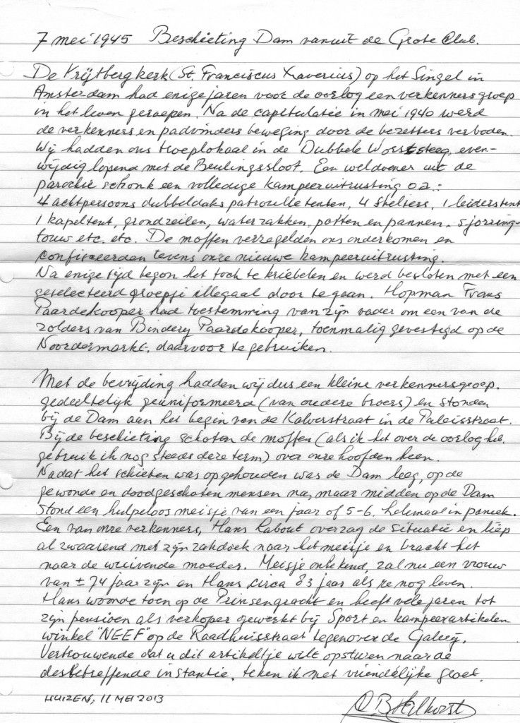 After the shooting stopped the Dam was empty, except the wounded and dead people, but in the centre of the Dam stood a helpless little girl of 5-6 years old, in panic. One of our scouts, Hans Labout waving with his hand, overlooked the situation and walked waving with his handkerchief to the little girl and brought her back to her waving mother. Girl unknown, she will be a women of about 74 years old and Hans about 83 if they are still alive.