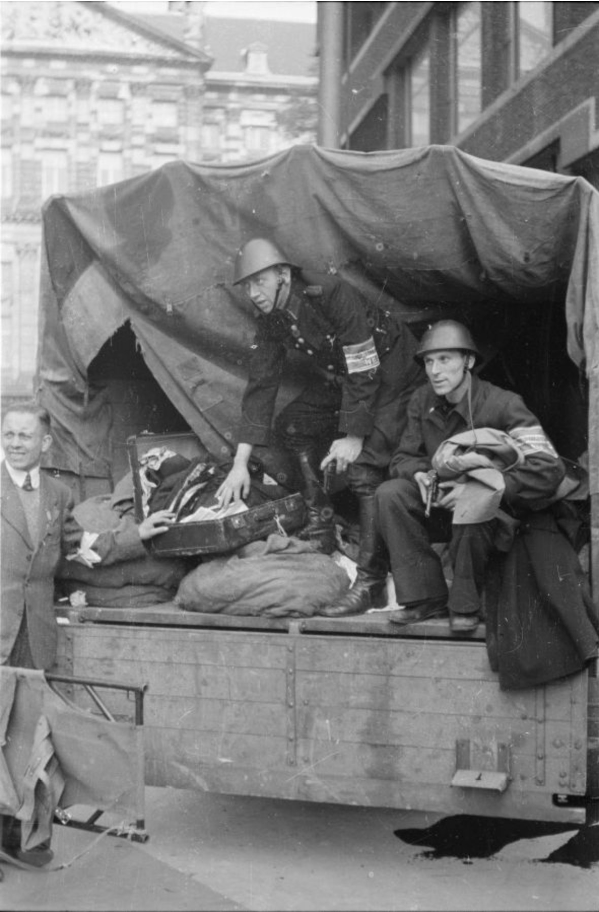 `Dat is ’t einde voor de S.S. boeven!’ schreef Hans Sibbelee bij een foto die hij op 7 mei 1945 maakte van een gevangengenomen man met de twee s’en als bliksemschichten op zijn uniformkraag. Het triomfantelijke bijschrift contrasteert met het beeld van een al wat oudere soldaat die weliswaar bezorgd voor zich uit blikt, maar toch vrij rustig met een hand in de zak een sigaret staat te roken. Maar Sibbelee kende de aanleiding voor de arrestatie, en zijn korte commentaar ademt de emotie van een ooggetuige van het geweld van de oorlog. De foto is gemaakt kort na het beruchte `Damincident’ toen, twee dagen na de bevrijding, in Amsterdam achtergebleven Duitsers het vuur openden op een menigte die op de Dam de komst van de bevrijders stond af te wachten.*