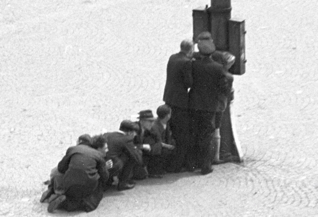 Ik stond ergens midden op de Dam op de kleine steentjes toen ik plotseling een massa mensen hollend en schreeuwend op mij af zag komen. Ik koos ervoor om niet mee te rennen en ging achter een paal van de stroomvoorziening van de tram staan en toen pas hoorde ik dat er geschoten werd met geweren en mitrailleur vanaf De Groote Club op de hoek van de Kalverstraat. Later bleek dat het soldaten van de Kriegsmarine waren. Ik kon toen niet meer weglopen en stond met mijn neus tegen de paal (op de bekende foto, de paal rechts), achter mij stond en lag een aantal mensen, die net als ik niet weggerend waren. Daar zaten en lagen we, midden in het schootsveld.