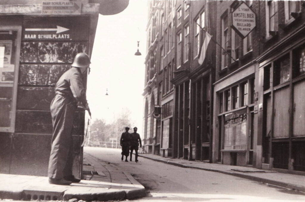 In deze dagen hebben we als een roes geleefd. Ik kreeg een perskaart van het Centrale Beeldarchief en daardoor de mogelijkheid overal met mijn neus op te zitten. Het verhoor van Puls heb ik meegemaakt, de man die van zichzelf zei, dat hij nou de “originele Pulser” was. Ik heb in een Canadese filmwagen rondgereden de stad door en foto’s naar hartenlust kunnen nemen. Ben met een Engelse majoor aan de overkant van het IJ geweest en heb met zijn soldaten de “Bataafsche” mee helpen bezetten. Heb de schietpartij in de Sint Olofssteeg nog meegemaakt, waar ik opeens van een wildvreemde vrouw een chocoladeflik kreeg en een “lekkertje”. Die schietpartij berustte volgens […] Berkhof op een misverstand. Een anarchist of een Duitser zat ergens op een dak, en schoot beurtelings op het Victoria Hotel en de mannen van de N.B.S. in de Sint Olofssteeg en animeerde de zaak. Een dergelijke oplossing geldt echter niet voor de Dam, waar kerels van de Duitse marine op de tjokvolle Dam geschoten hebben, resultaat 10 doden en 20 ernstig gewonden.